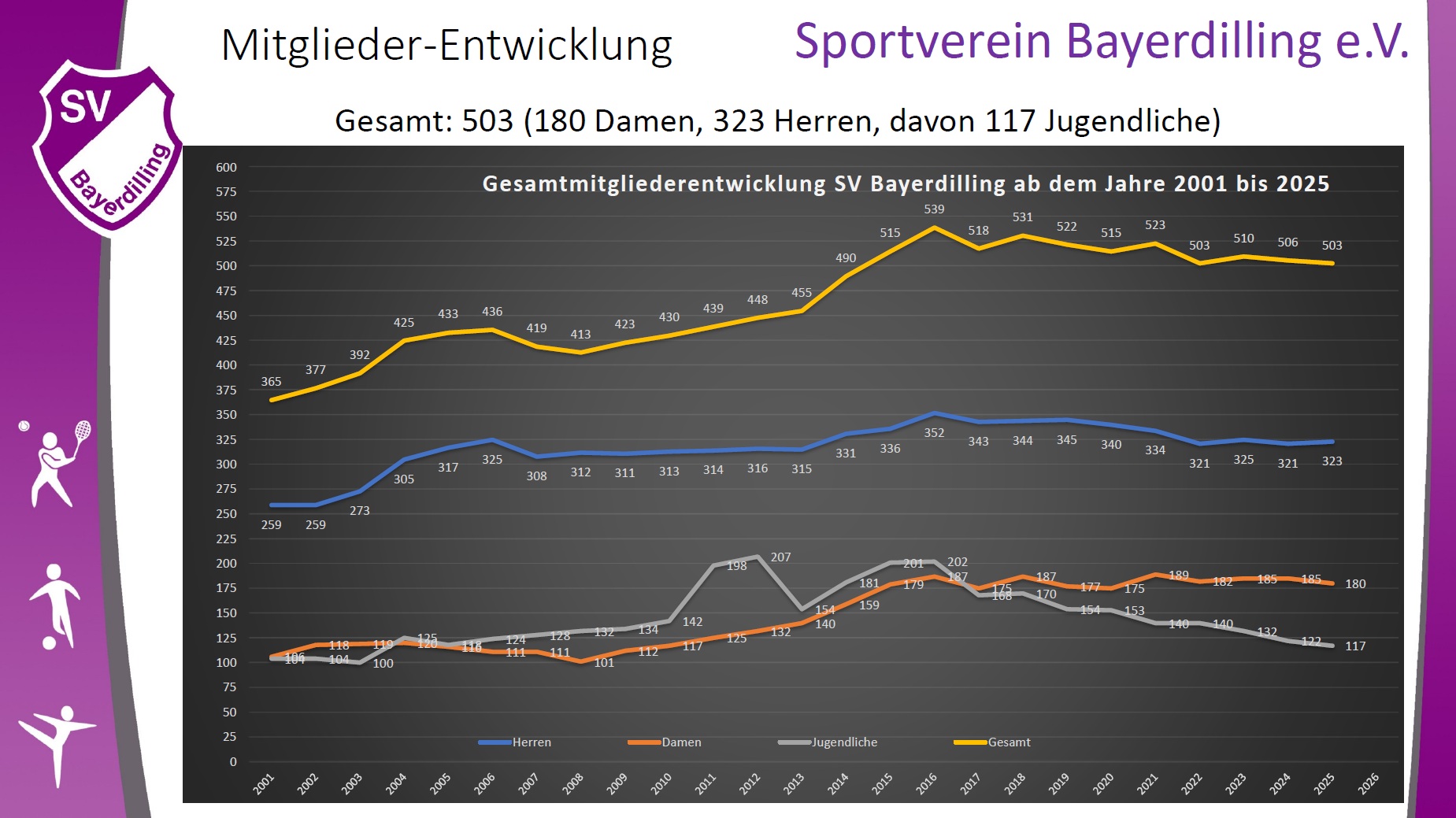 Seit der Gründung im Februar 1948 stiegen die Mitgliederzahlen des SV Bayerdilling stetig an. Interessant ist auch, dass bis in die 70iger Jahren nur Männer dem Verein angehörten. Erst als die Sparten Gymnastik und Tennis hinzukamen, sind vermehrt die Frauen in den Verein eingetreten. Deutlich sieht man auch den Zeitpunkt der Gründung der beiden Abteilungen, als Anfang der 80iger Jahre die Mitgliederzahlen enorm stiegen Die nächste deutliche Steigerung wurde durch das Zustandekommen der Damenmannschaft und die Gründung der Basketballabteilung Anfang des neuen Jahrtausend, wobei die Mitgliederzahl an die 400 Marke stieg. Seit dieser Zeit blieb die Mitgliederzahl stetig im Bereich 420 bis 440. Durch die Auflösung der Basketballabteilung 2007 und der Damenmannschaft in 2008 gingen die Mitgliederzahler auf 410 Personen zurückging. Aufgrund stetigem Zuwangs im Jugendbereich bewegen sich die Mitgliederzahlen bei ca. 420-450 Personen, ca. 1/3 davon sind Jugendliche bis 17 Jahre.