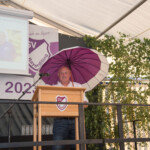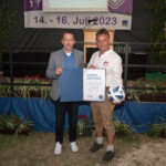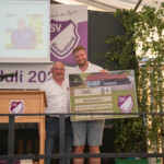 Der Abend wurde dann von Vorstand Michael Koppold auf der festlich geschmückten Bühne mit Grußworten offiziell eingeleitet. Nach einer kurzweiligen Vorstellung des Vereins und der aktuellen Aktivitäten bedankte er sich bei allen, die in welcher Weise auch immer zum Gelingen des Vereinslebens beitragen. Danach kam Schirmherr Heinz Vollmair zu Wort, der mit einem lila-weißen Regenschirm die Bühne betrat. Er bedankte sich für die Regentschaft zum Jubiläum, auf die er wahrlich stolz ist. Er überraschte den Jugendleiter Tilo Volgmann mit einem Scheck zum Wohle der SVB-Jugendarbeit. Auch Abteilungsleiter Flo Müller holte er zu sich, um ihm einen Spielball zu überreichen. Danach sprach Christoph Kern seine Grußworte im sehr gut besuchten Festzelt. „Die Basis des Amateurfußballs in Bayern sind unsere Amateurvereine – so, wie der SV Bayerdilling, der mit seinen Mitgliedern für Beständigkeit, Zuverlässigkeit und Gemeinschaft steht. Umso mehr freue ich mich, dass wir dem SV Bayerdilling als Ausdruck der Wertschätzung heute mit der Ehrenurkunde auszeichnen können. Das dreitägige Festwochenende soll jedoch nur der Anstoß sein, für die nächsten 75 Jahre überragende Sportgeschichte“, sagte er in seiner Rede. Zur Schar der BFV-Gratulanten zählten neben Christoph Kern auch die schwäbische Delegation um die Bezirks-Vorsitzende Sabrina Hüttmann, den Kreis-Vorsitzenden Thomas Künzel, Kreis-Spielleiter Günther Behr sowie Kreis-Schiedsrichterobmann Jürgen Roth und die Kreis-Ehrenamtsbeauftragte Michaela Kruber. Auch BLSV Kreisvorsitzender Roland Pickhard gab dem SVB die Ehre. Im Anschluss wurde von Michaela Kruber die Ehrung von drei verdienten Mitgliedern vorgenommen. Peter Wegele, Josef Schoder und Andreas Huber wurden Ehrennadeln für ihre langjährigen Tätigkeiten in verschiedenen Funktionen überreicht.
